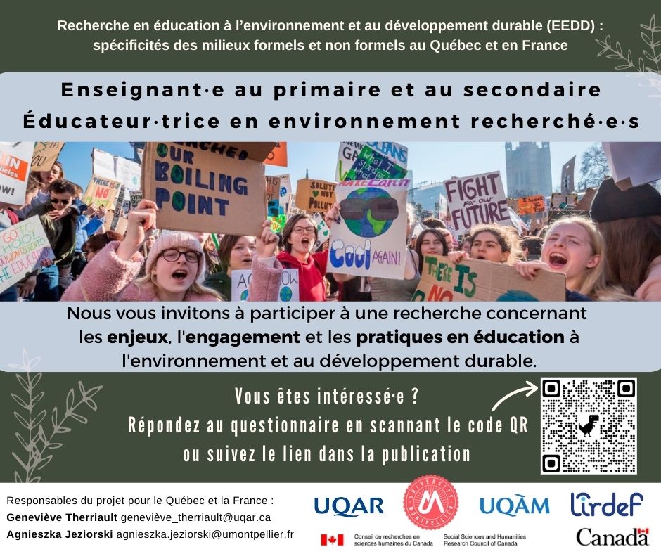 Vous êtes éducateur en environnement ou enseignant du primaire et du secondaire actuellement en exercice en France ou au Québec ? Des chercheurs vous demandent de remplir un questionnaire concernant les enjeux, l'engagement et les pratiques éducatives liés à l'EEDD. Il faut compter 20 à 25 minutes pour le remplir.
